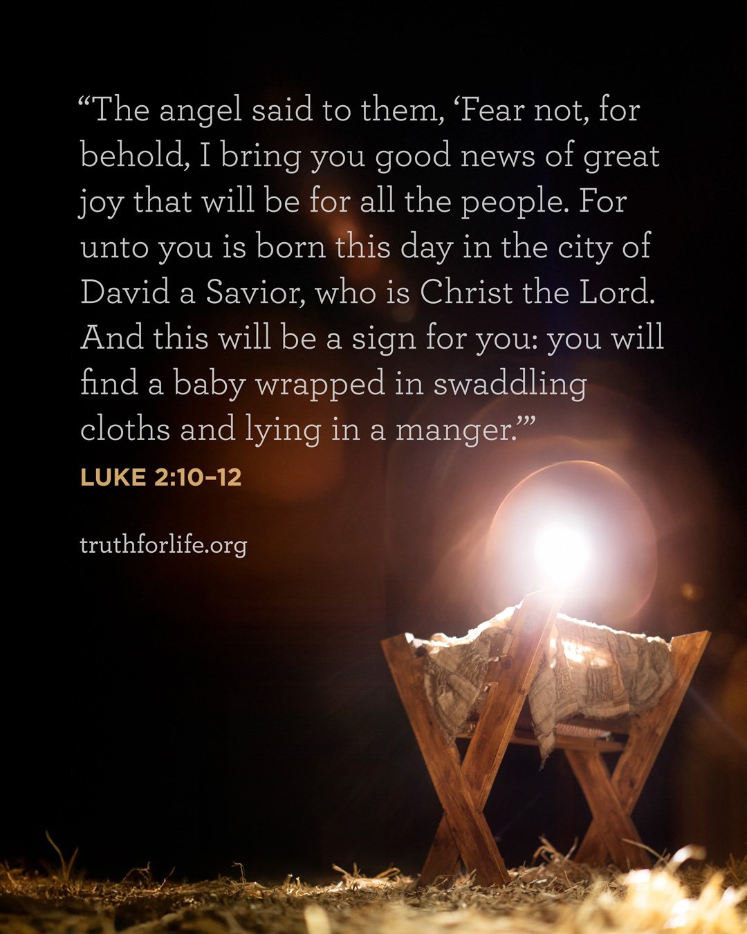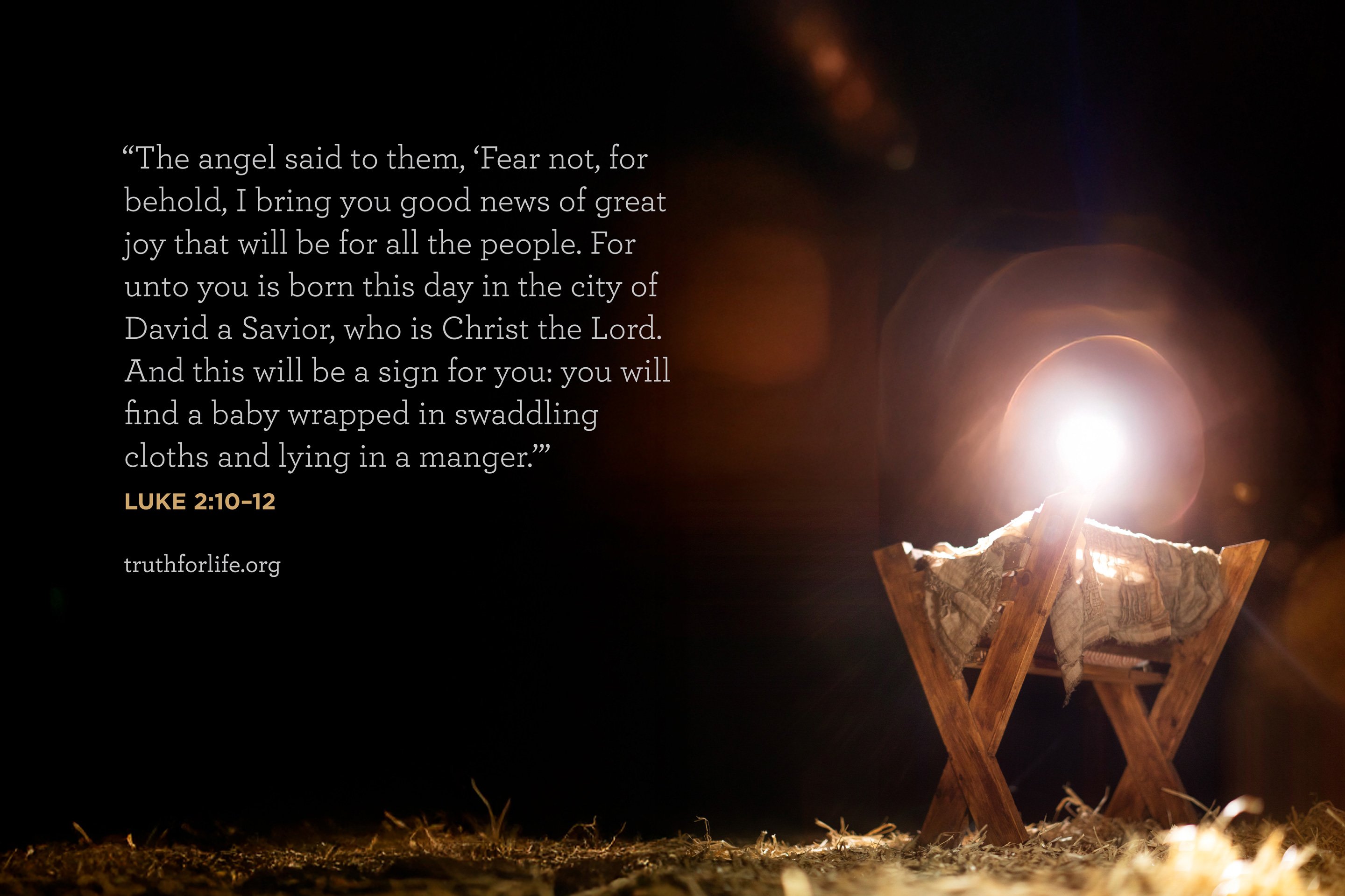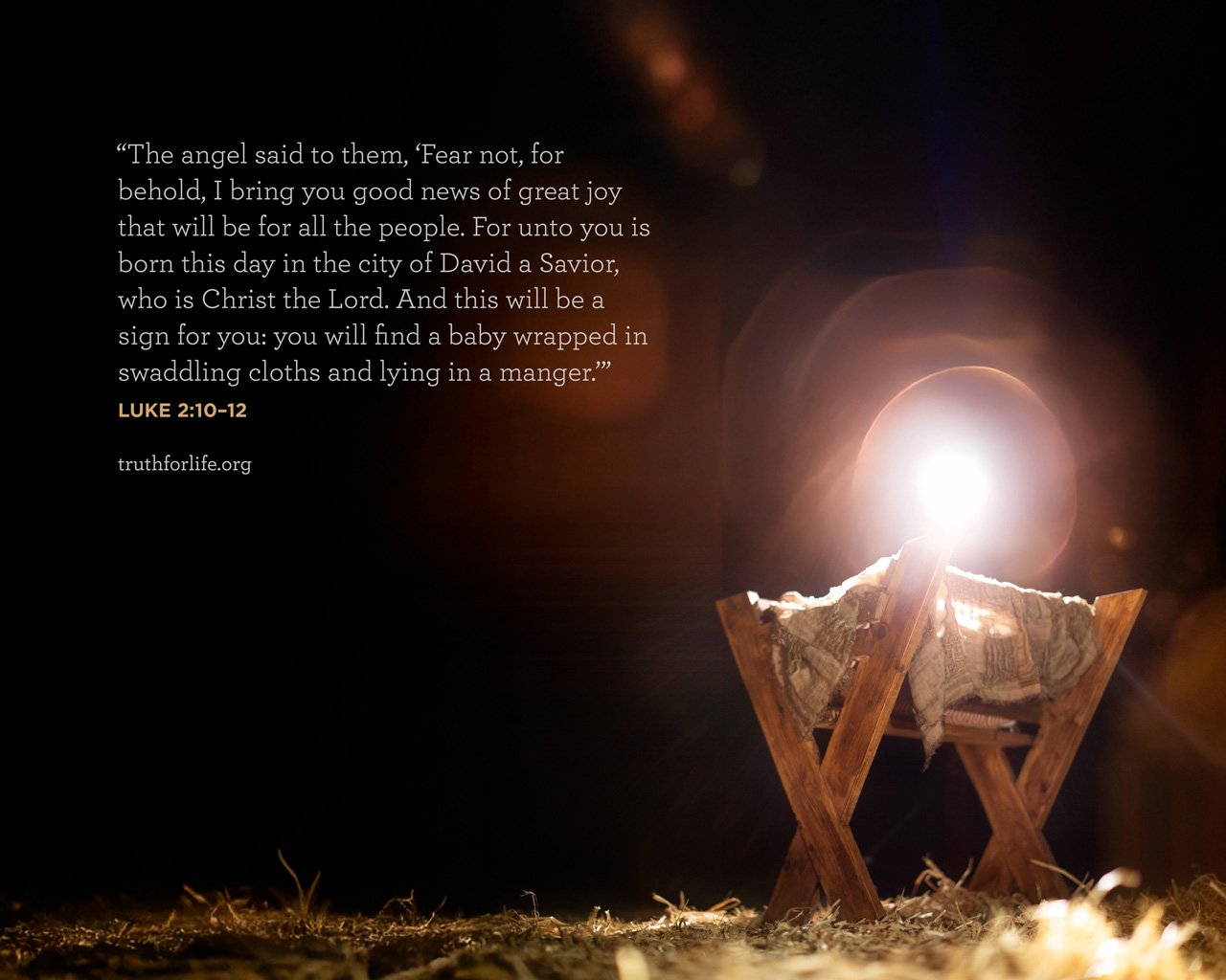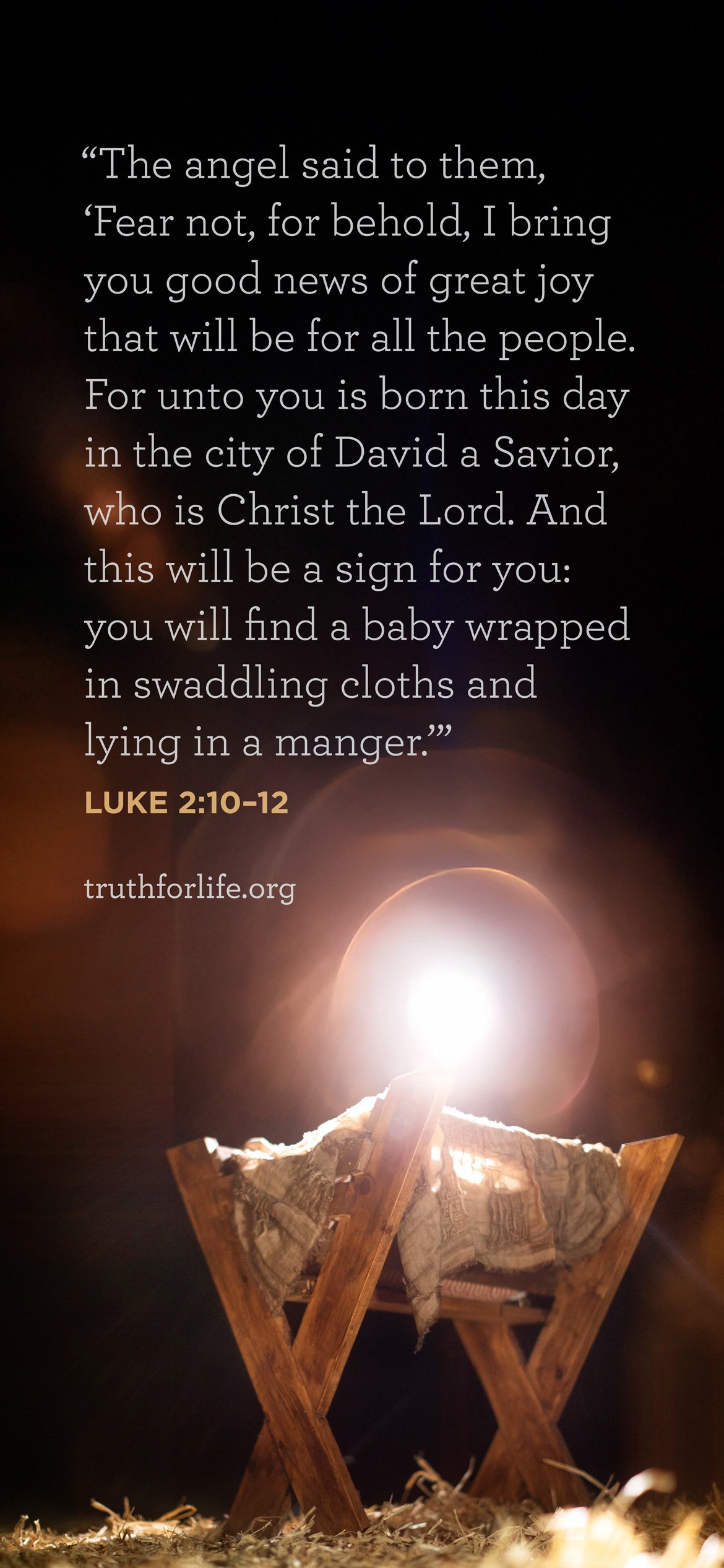 “The angel said to them, ‘Fear not, for behold, I bring you good news of great joy that will be for all the people. For unto you is born this day in the city of David a Savior, who is Christ the Lord. And this will be a sign for you: you will find a baby wrapped in swaddling cloths and lying in a manger.’”