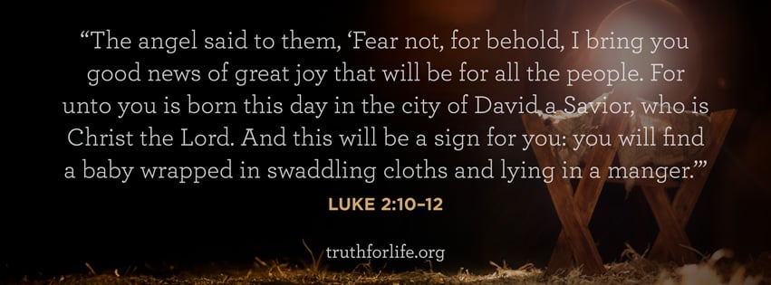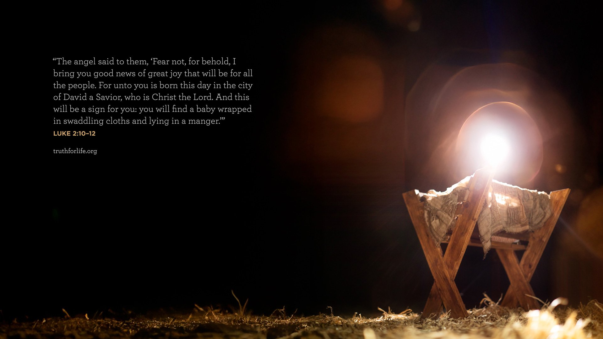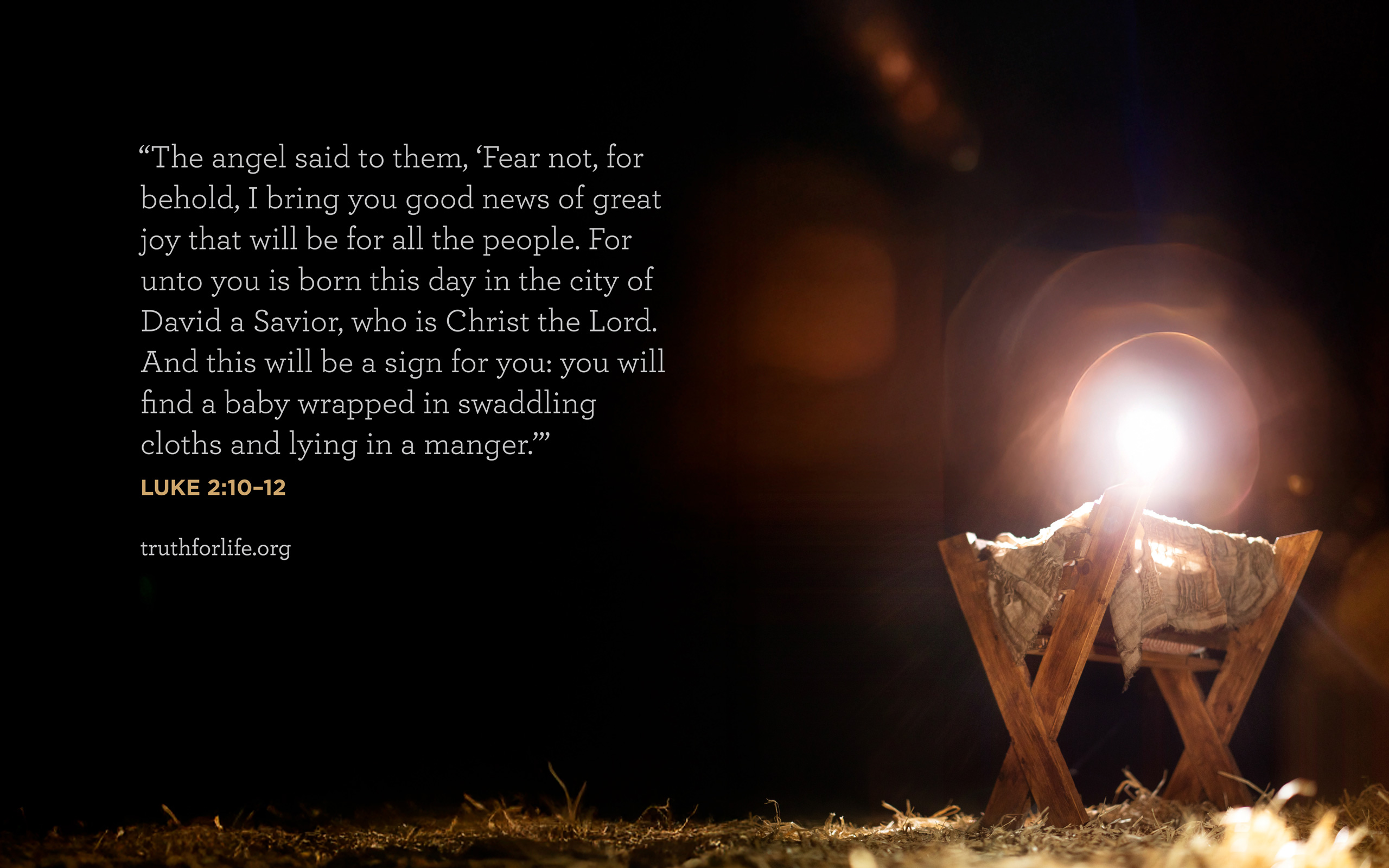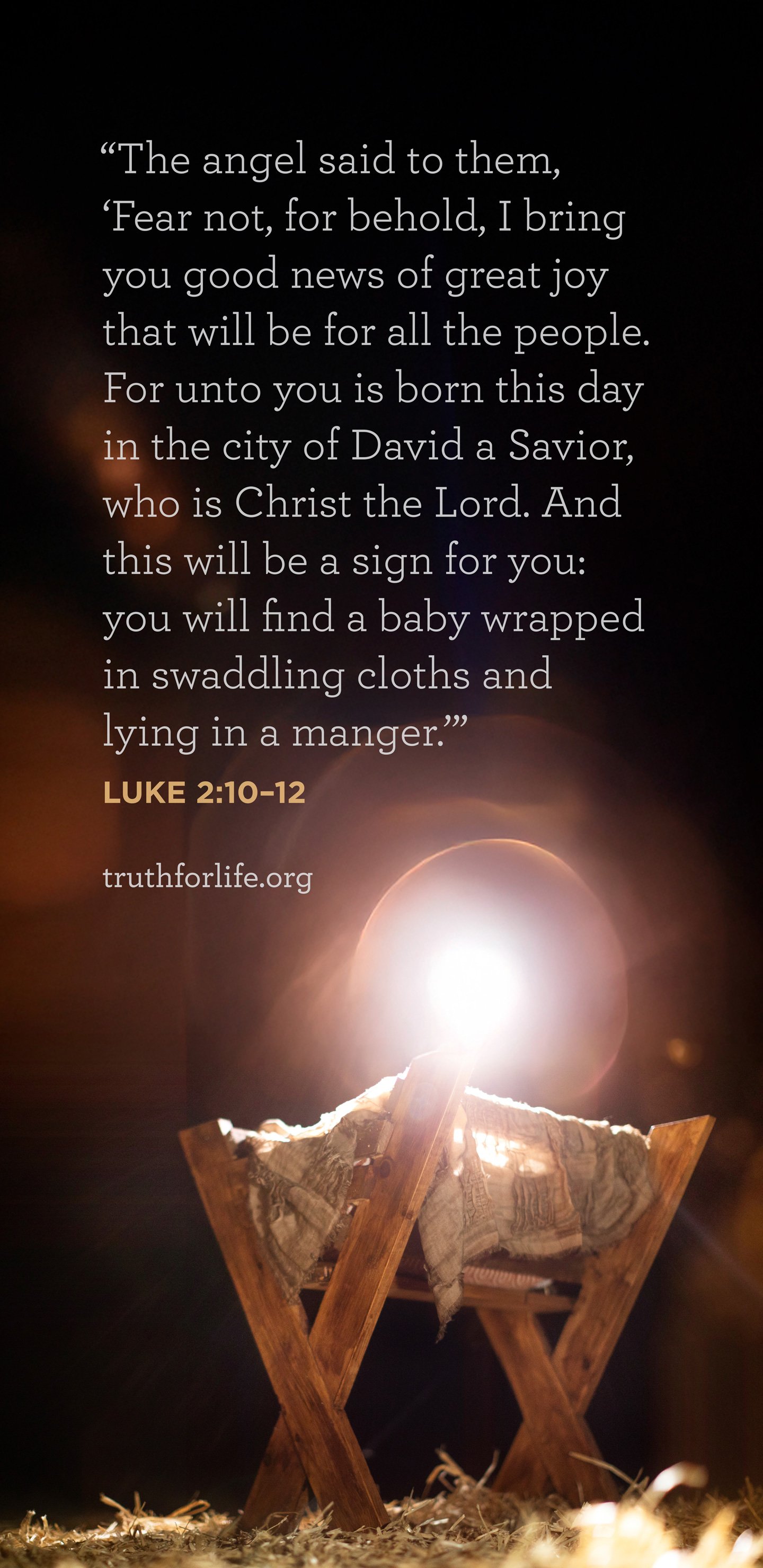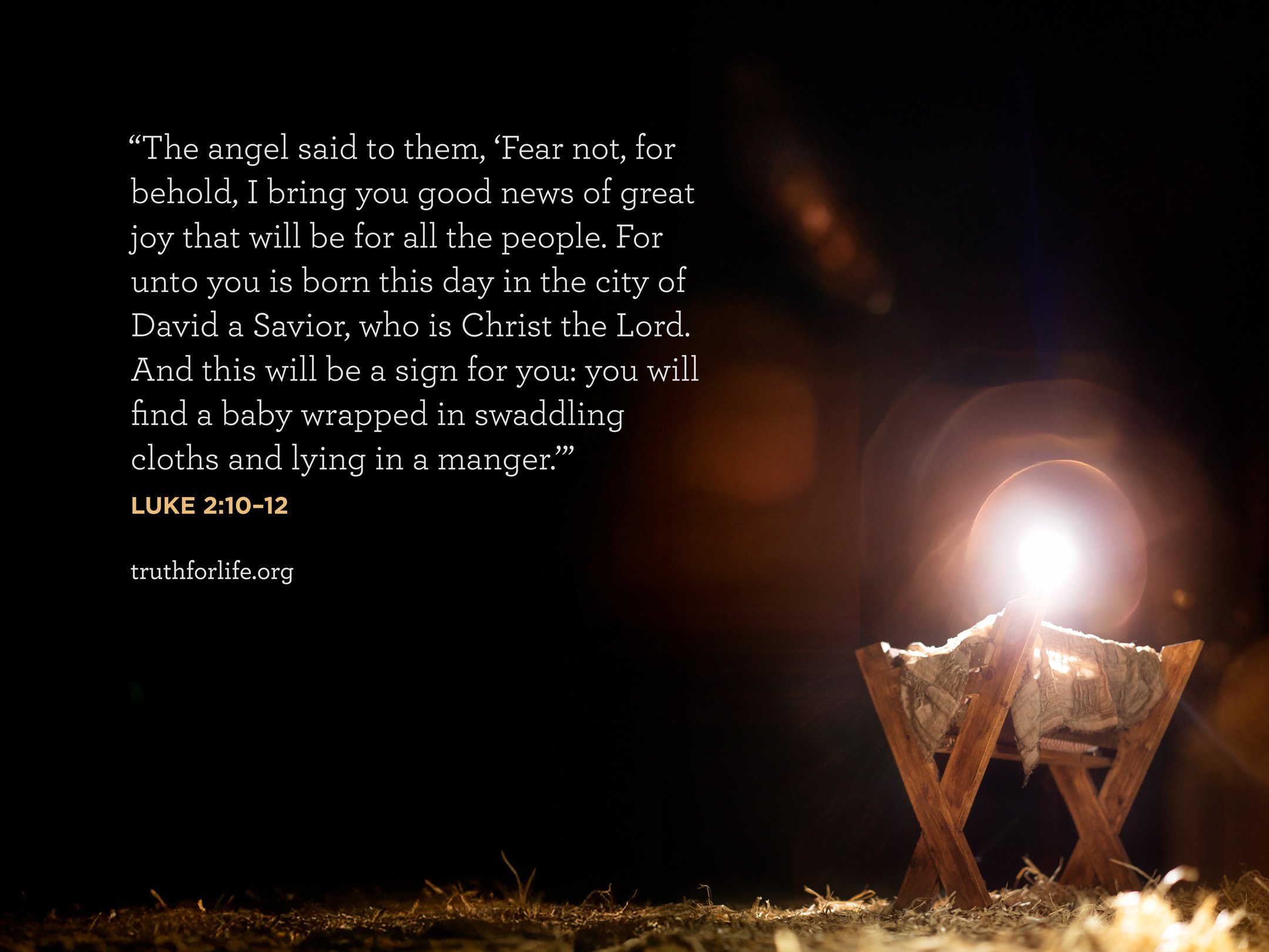 “The angel said to them, ‘Fear not, for behold, I bring you good news of great joy that will be for all the people. For unto you is born this day in the city of David a Savior, who is Christ the Lord. And this will be a sign for you: you will find a baby wrapped in swaddling cloths and lying in a manger.’”