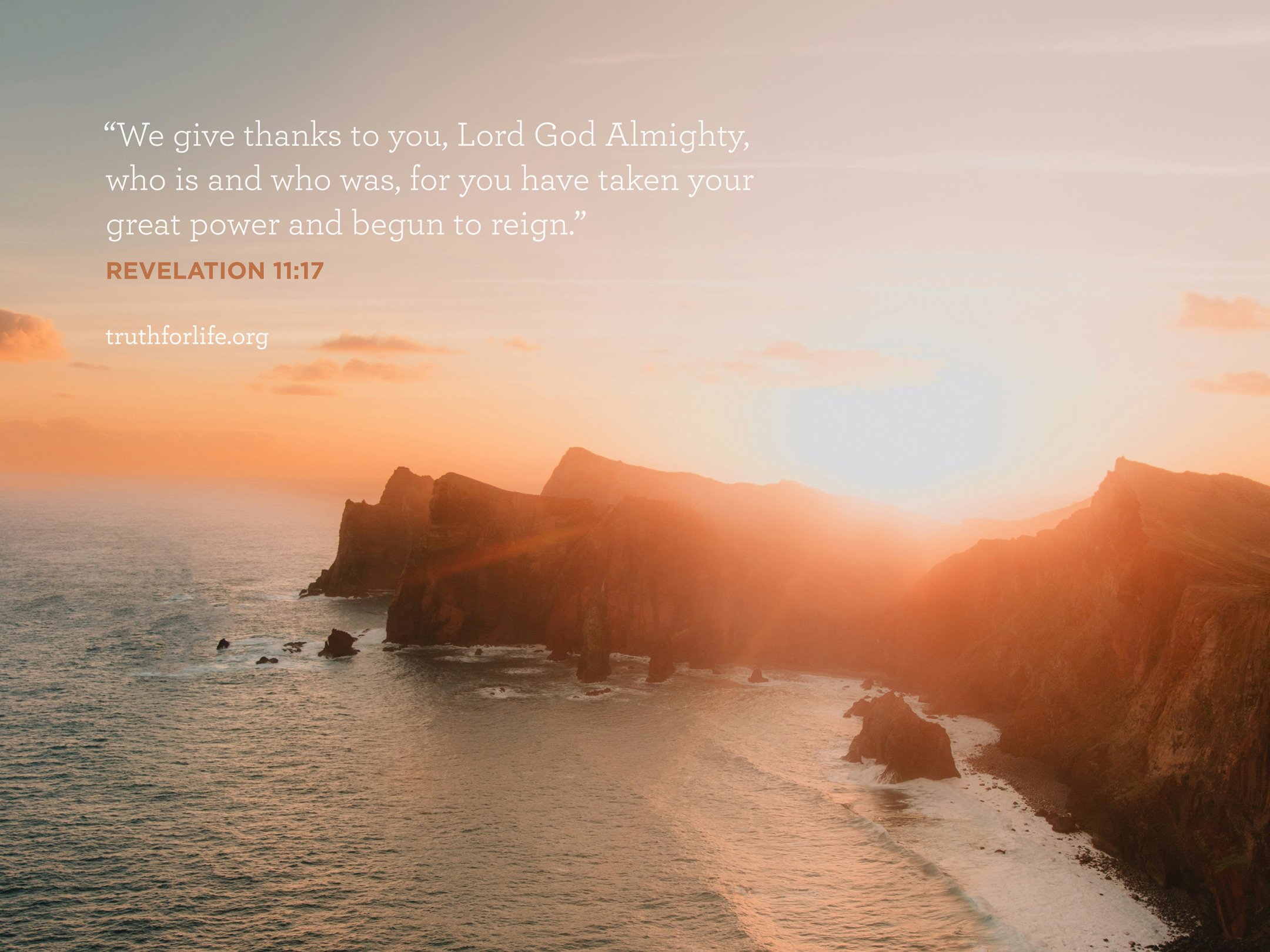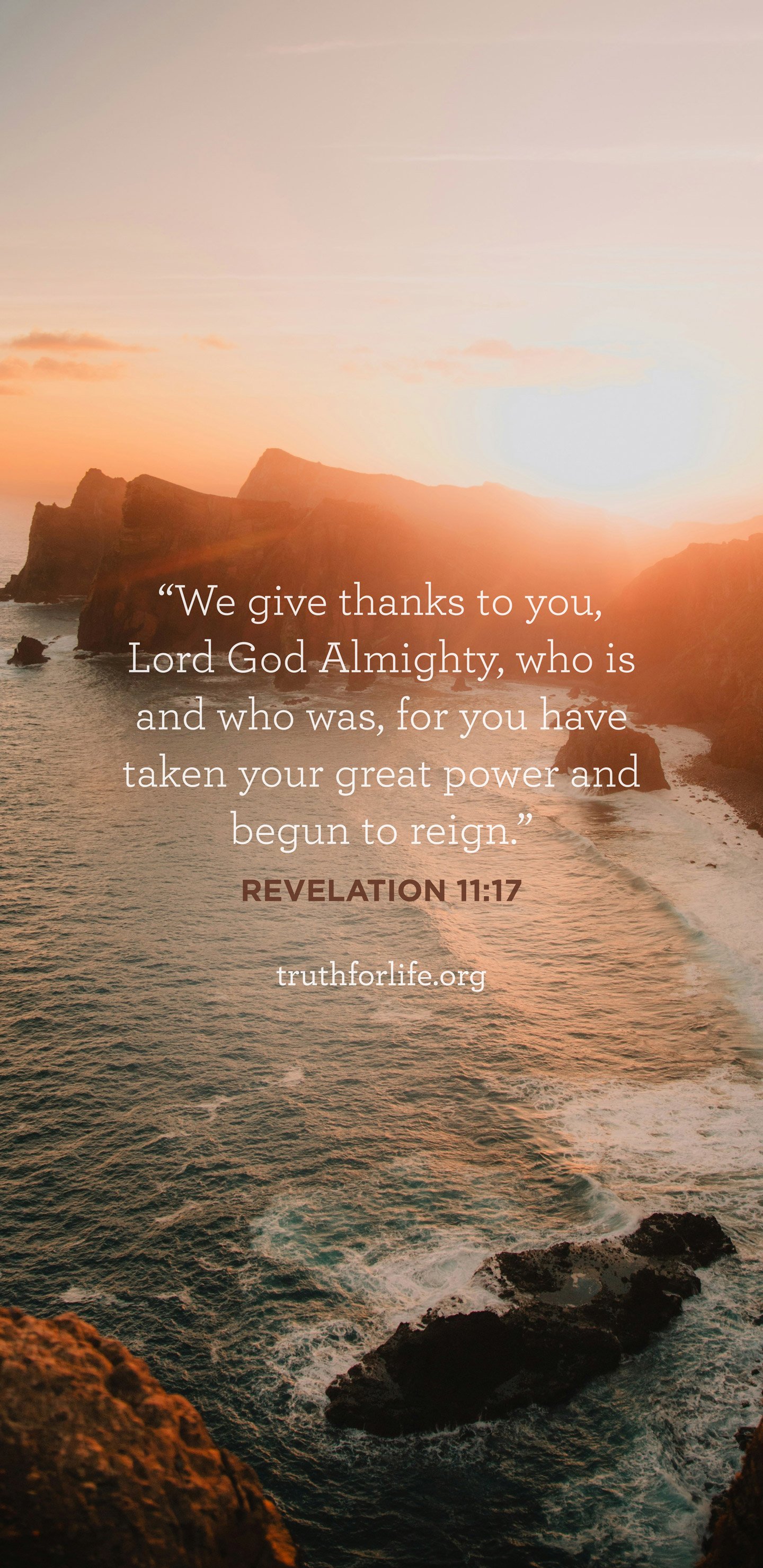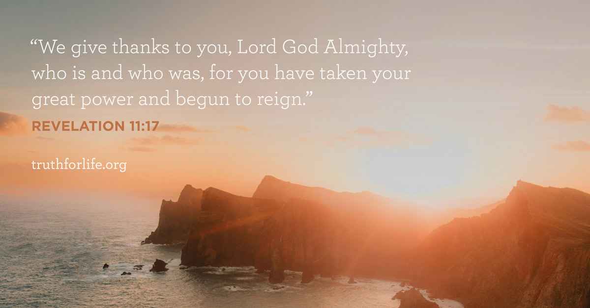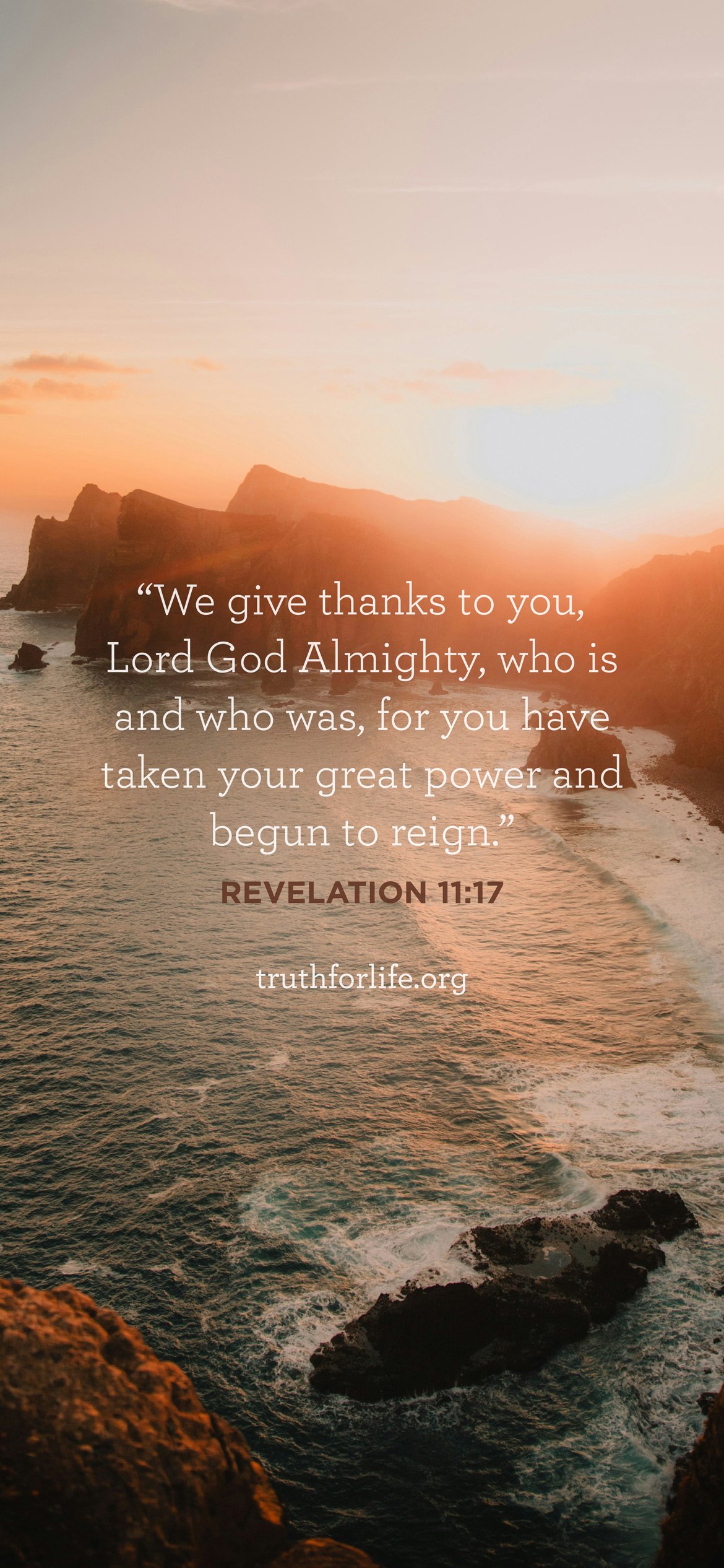 “We give thanks to you, Lord God Almighty, who is and who was, for you have taken your great power and begun to reign.”