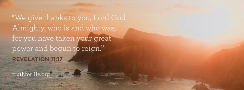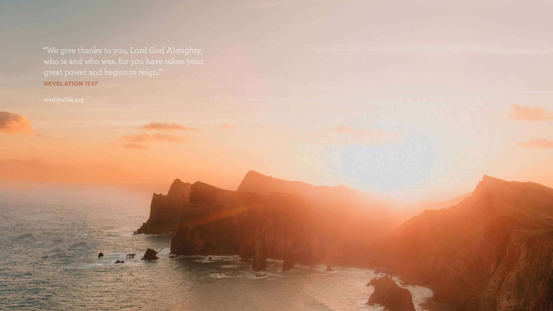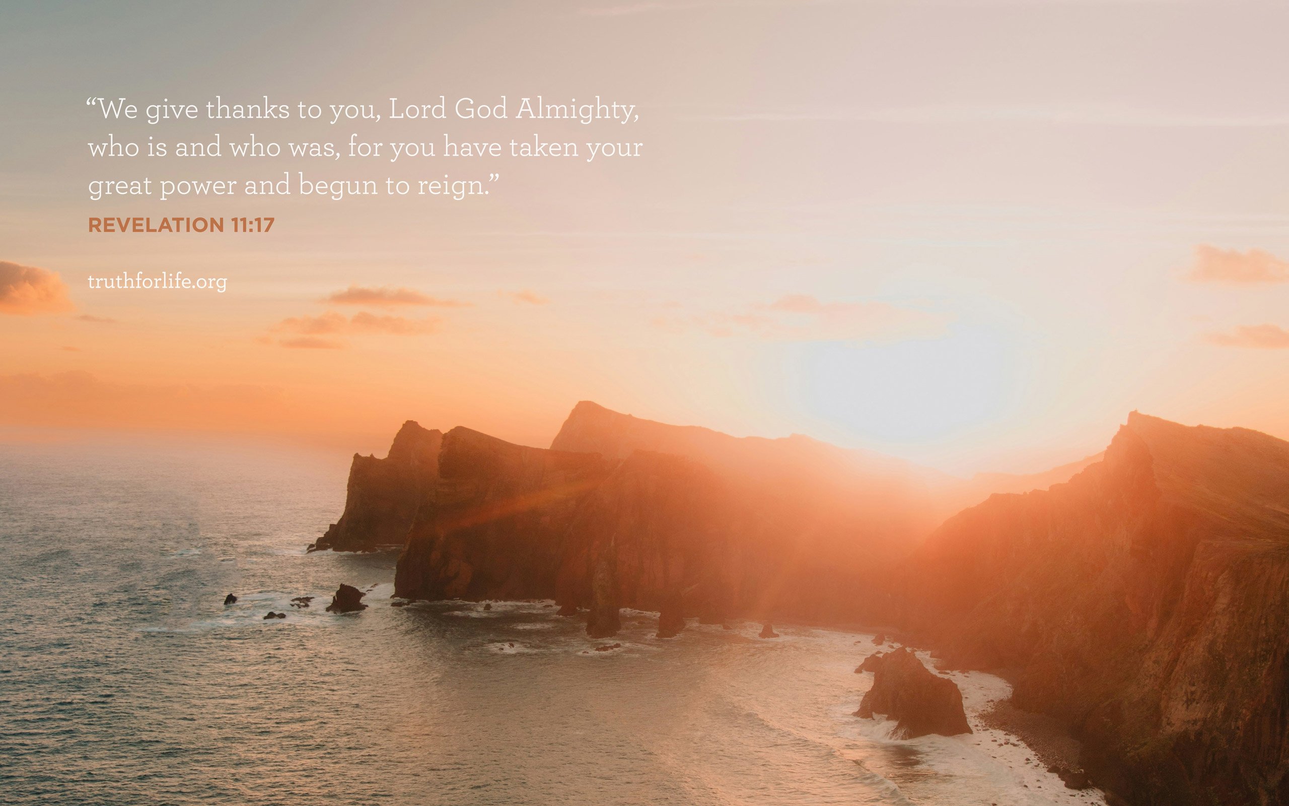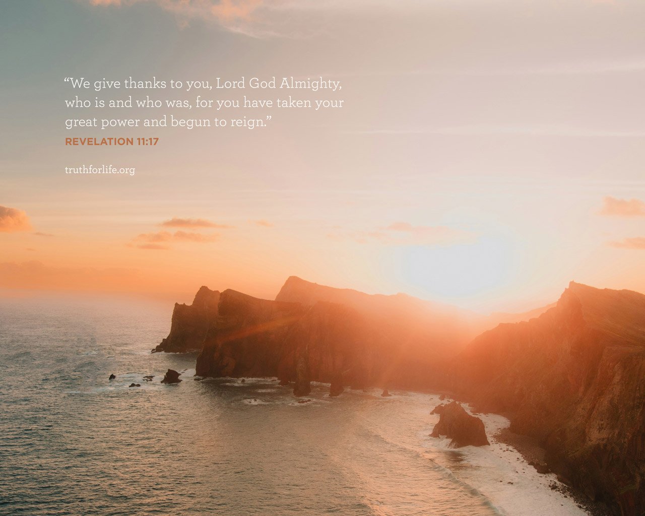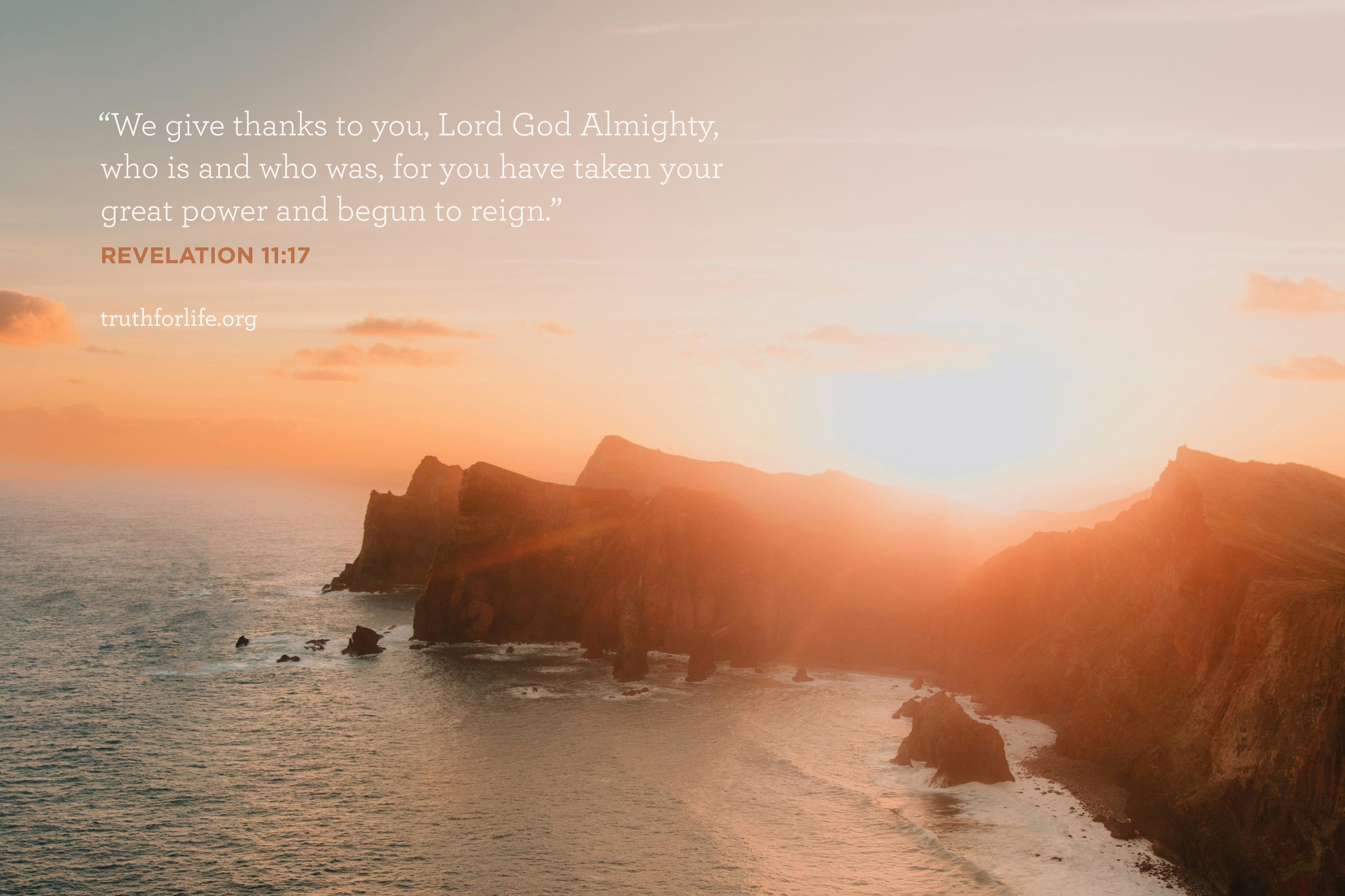 “We give thanks to you, Lord God Almighty, who is and who was, for you have taken your great power and begun to reign.”